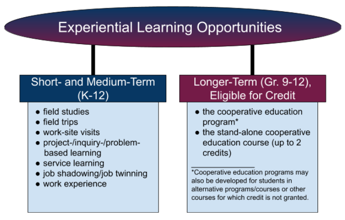 A program that allows students to earn secondary school credits while completing an experiential learning opportunity connected to a community. In the context of the policy framework proposed in this document, a cooperative education program includes a classroom component and a community component. The community-connected experiential learning opportunity enables students to apply and further develop the knowledge and skills described in the expectations of a related course from the Ontario curriculum.