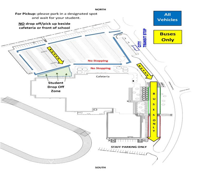 - Drop-offs and pick-ups occur at the Northwest entrance (west of the gym entrance).